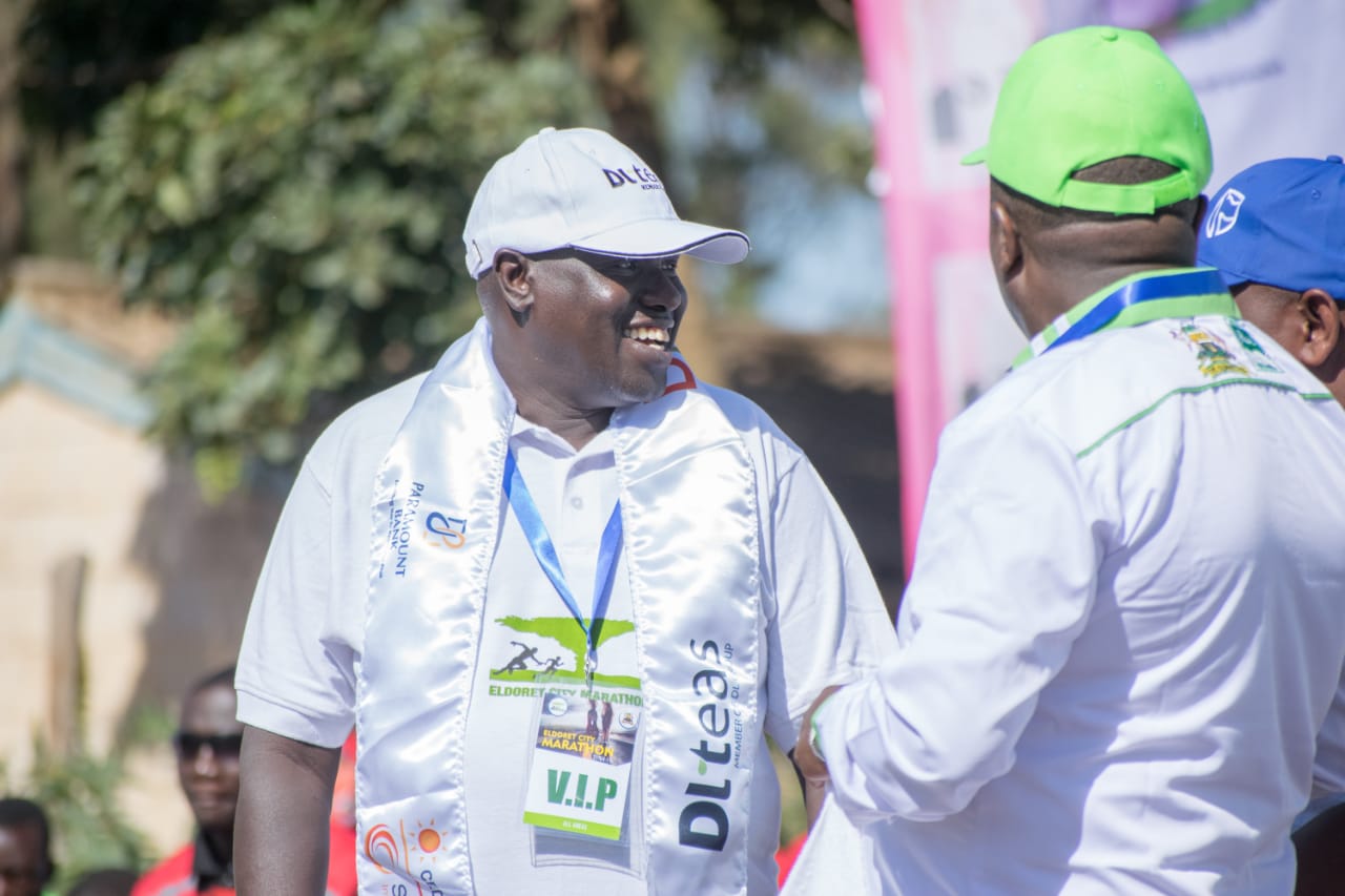 Group chairman Dr.David Langat pause at the finish line awaiting to award top female athlete. Looking on is Northrift Athletics Kenya Chairman Mr Solomon